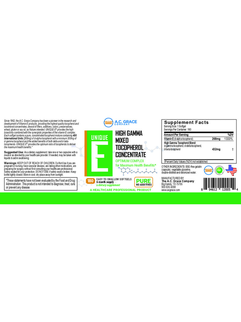 Since 1962, the A.C. Grace Company has been a pioneer in the research and development of Vitamin E products, providing the highest quality tocopherol and tocotrienol concentrates, devoid of fillers, additives, colors, preservatives, wheat, gluten or soy oil, as Nature intended. UNIQUE E provides the high bioactivity combined with the synergistic properties of the vitamin E complex.