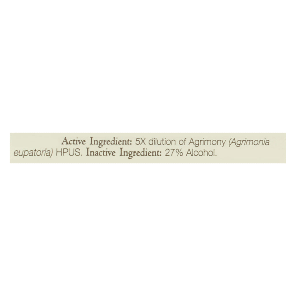 ACTIVE INGREDIENTS: 5x dilution of Agrimonia Eupatoria HPUS. INACTIVE INGREDIENTS: 27% Alcohol.