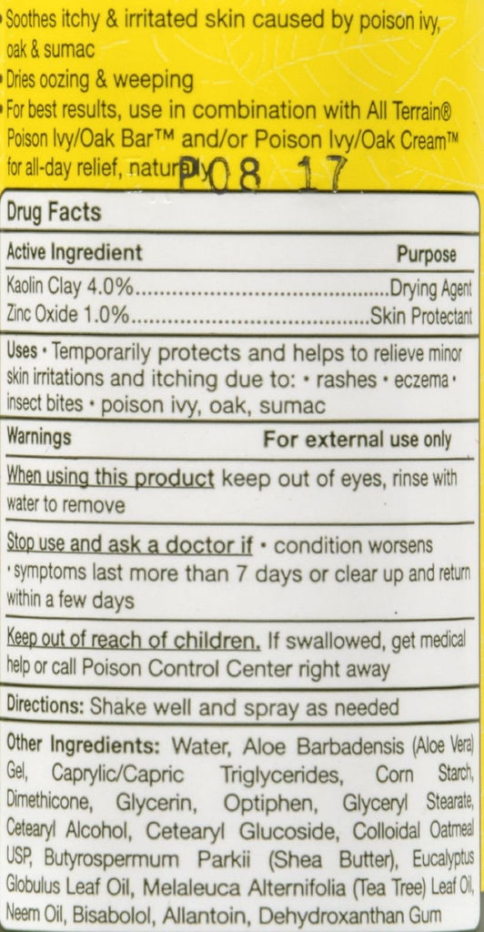 All Terrain Poison Ivy And Oak Spray Description: Natural And Effective Poison Ivy, Oak, Sumac Drying Spray Cruelty Free Dries The Oozing And Weeping Of Poison Ivy, Oak, Sumac. Free Of Cruelty.