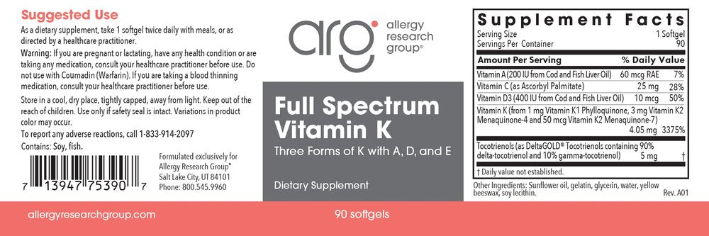Allergy Research Group, Full Spectrum Vitamin K with A, D, and E, 90 Softgels