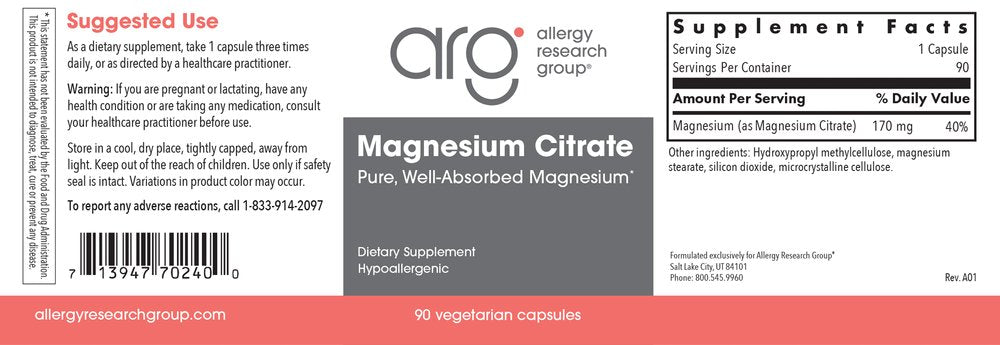 Allergy Research Group, Magnesium Citrate, 90 Vegetarian Capsules