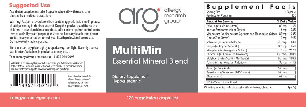 Allergy Research Group's classic mixed mineral formulation, as developed by Stephen A. Levine, Ph.D. MultiMin provides macrominerals, trace minerals, and ultra-trace minerals. Glutamic acid is included as a mildly acidifying agent.