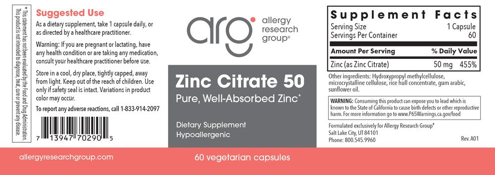 Allergy Research Group, Zinc Citrate 50 mg, 60 Vegetarian Capsules
