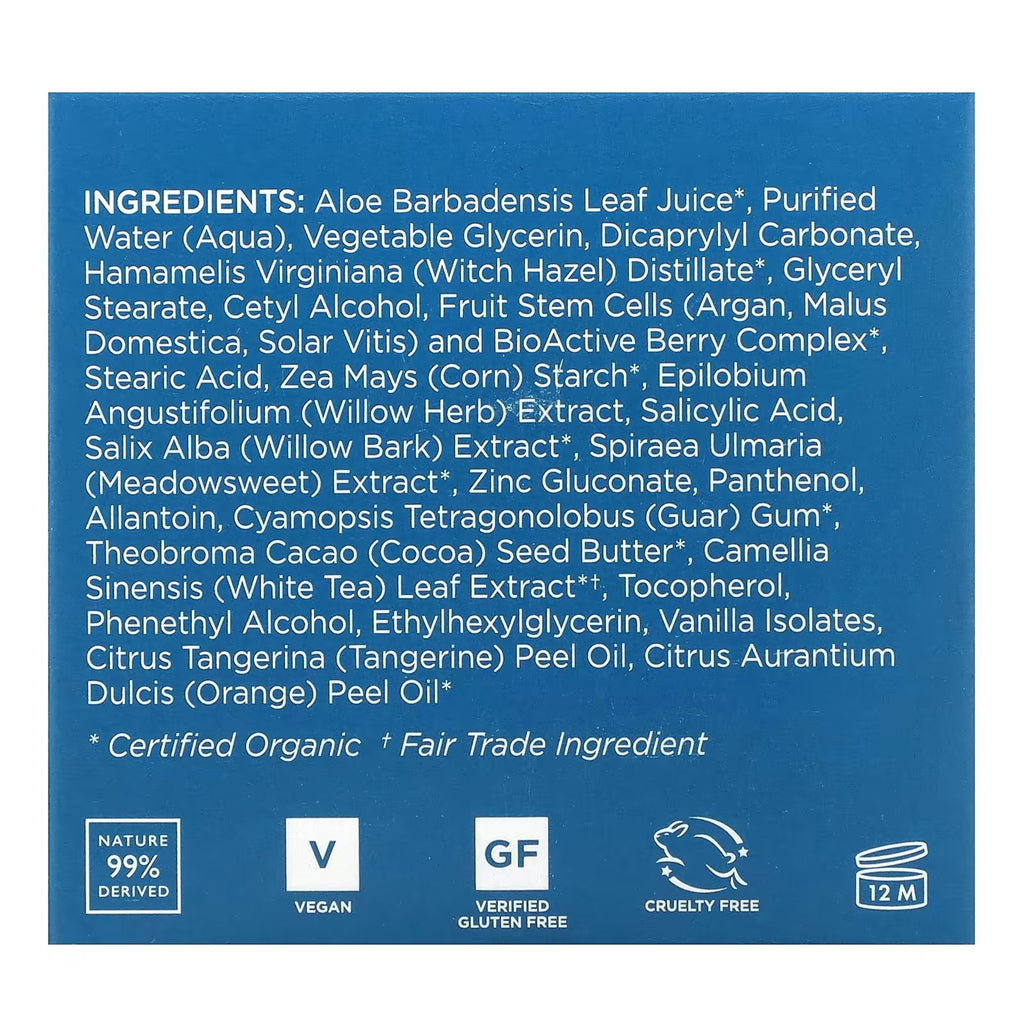 Fruit stem cell complex with argan stem cells, willow bark and salicylic acid help clarify pores, curb bacteria, absorb excess oil and fade the appearance of post-blemish pigmentation as aloe vera polysaccharides deeply hydrate and calm inflammation for a clear, balanced complexion.