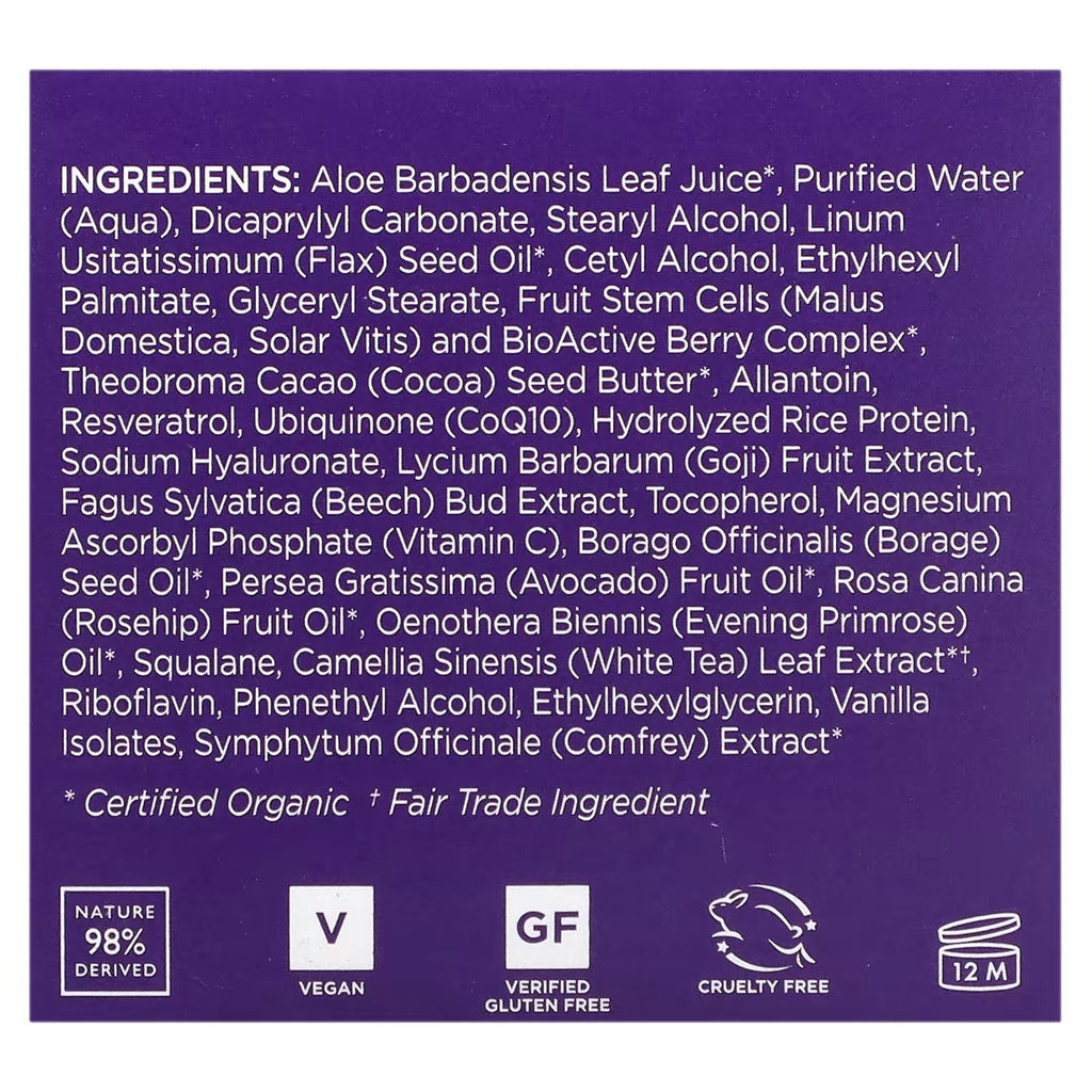 Fruit stem cell complex and resveratrol CoQ10, super antioxidants, boost dermal vitality as goji glycopeptides uplift tone and texture overnight for velvety soft skin with the appearance of fewer fine lines and wrinkles and a rejuvenated complexion.