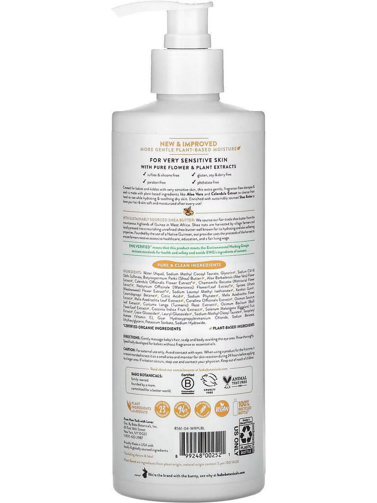 Created for babies and kiddos with sensitive skin, this mild cleanser is enriched with sustainably sourced nourishing shea butter and comes in a post-consumer recycled plastic bottle. Made with 23 plant-based ingredients such as calendula, shea butter and aloe vera. Perfect for daily use even on the most delicate skin. This gentle formula is EWG Verified® and fragrance free to ensure the highest level of safety and quality. Light and airy, this baby shampoo & wash rinses clean and leaves skin and hair feeling extra soft and moisturized.