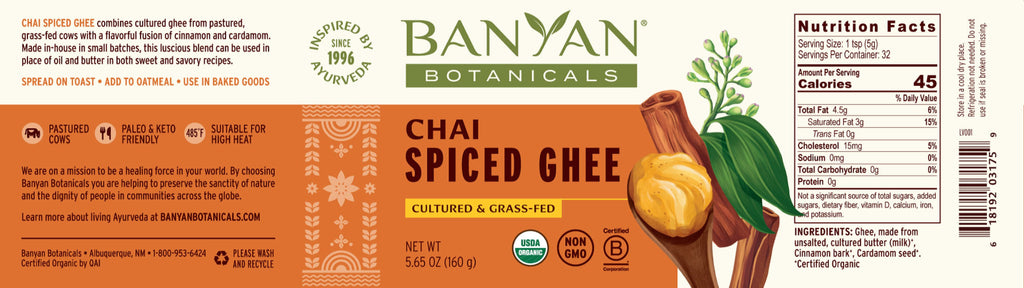 Chai Spiced Ghee combines our creamy cultured ghee (clarified butter) with rich and warming spices, cardamom and cinnamon. Our ghee is made from the finest organic, cultured butter that comes from small family farms in Northern California where the cows are given tender loving care, grass-fed, and pasture raised. Banyan's ghee is handmade in small batches so that all the lactose, whey, and casein is naturally removed from the clarified butter to create a golden, rich, pure organic ghee. A delicious alternative to butter and other oils, try ghee melted over rice, dolloped in soup, drizzled over popcorn, or even added to your morning coffee. Ghee has a high smoke point of 485°F, which makes it ideal for sautéing, frying, and baking. This ghee is free of gluten, sodium, trans fats, and GMOs, and there is no refrigeration necessary. Ghee has a long shelf life when kept free of food debris and moisture.