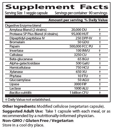 Best Digestive Enzymes – All Vegetarian is a uniquely formulated, full-spectrum high potency digestive enzyme blend created to complement and support the body's own digestive capacities. Each capsule provides the body with enzymes designed to optimally aid the digestion of fats, proteins and carbohydrates present in cooked and raw food. The formula supplies the added support of alpha- galactosidase and beta-glucanase to break down vegetables, beans and grains, and enzymes such as glucoamylase and invertase to assist with the digestion of sugars. In addition, this complete formula contains friendly bacteria to uniquely promote optimal intestinal health.
