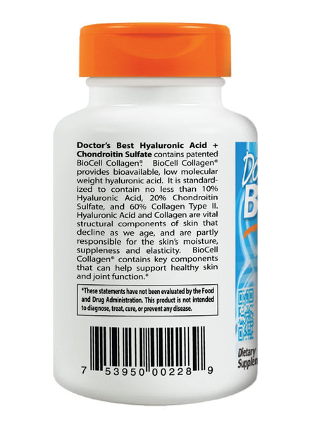 Best Hyaluronic Acid wth Chondroitin Sulfate contains patented BioCell Collagen II(US patents 6,025,327; 6,323,319; and 6,780,841). BioCell Collagen IIis sourced from chicken sternal cartilage and provides bioavailable, low molecular weight hyaluronic acid. It is standardized to contain 10% Hyaluronic Acid, 20% Chondroitin Sulfate, and 60% Collagen Type II.