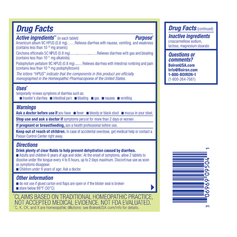 Boiron Diaralia meltaway tablets melt in your mouth to relieve diarrhea and traveler's diarrhea with intestinal pain, bloating, gas, nausea, and vomiting. This homeopathic medicine works gently on the body without risk of constipation, drowsiness, or stool discoloration common with other medications.