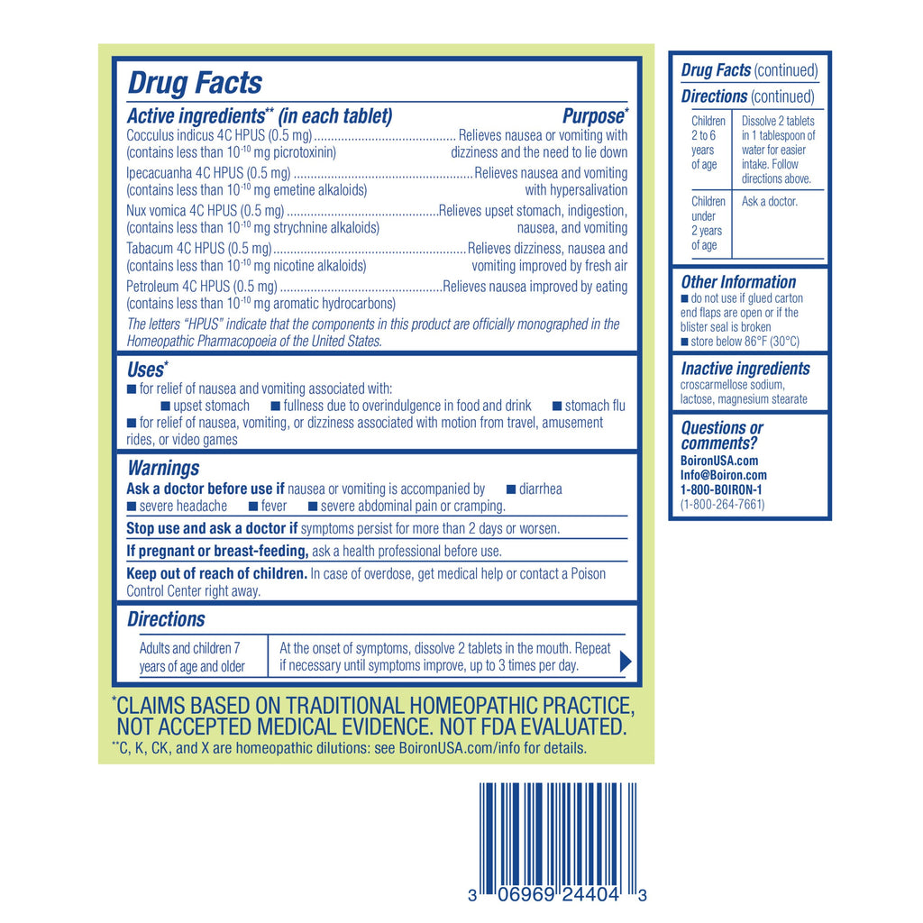 NauseaCalm by Boiron relieves nausea and vomiting from everyday causes, including stomach flu, using plant-based and other pure active ingredients. It also works for motion sickness nausea. Convenient and easy for the whole family to take, the meltaway tablets dissolve in the mouth without food or water for relief anywhere, anytime.