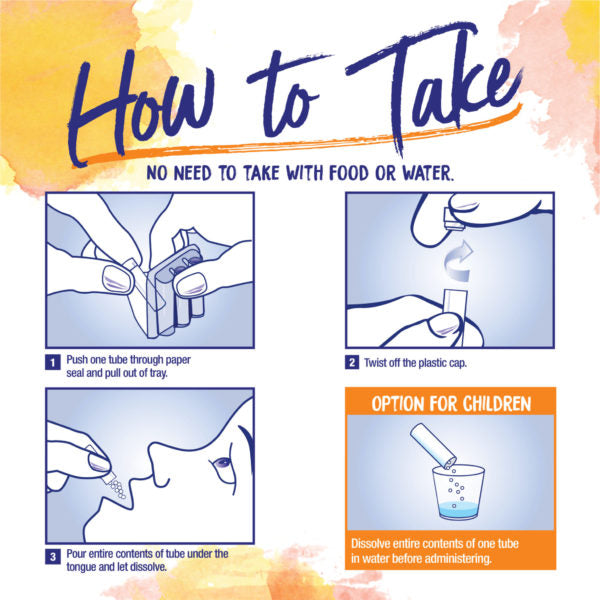 Adults and children 2 years of age and older: Dissolve entire contents of one tube in the mouth every 6 hours, up to 3 times a day.