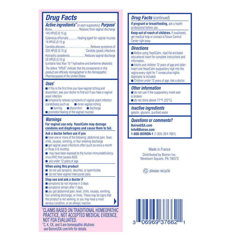 If you suffer from yeast infections, it’s time to get relief. YeastCalm by Boiron calms the discomfort of minor vaginal itching and burning from yeast infections with plant-based and other pure active ingredients. Plus, it’s powered by borax and Calendula to heal delicate vaginal tissue. YeastCalm is a comfortable and practical solution that’s free of parabens and preservatives. These once-daily overnight Suppositories conveniently deliver treatment directly to the affected area for continued improvement throughout the night.
