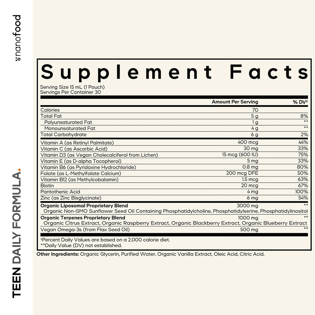 - Liquid daily teens vitamins A, B, C, D & E all-in-one