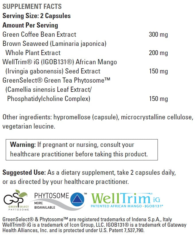 To provide the most comprehensive support for weight management, you need more than the standard metabolic health support. Special attention should be paid to the endocrine aspects of metabolism and appetite - in addition to normal fat absorption, use and storage. Supporting a healthy balance of leptin and ghrelin is essential to providing a long term weight management strategy for your patients. Adipo-Leptin Benefits™ offers the right evidence-based ingredients to make that strategy work. With green coffee bean extract, brown seaweed, WellTrim® iF (IGOB131®) African Mango seed extract and GreenSelect® Phytosome™, Adipo-Leptin Benefits™ has everything you need to break through weight loss barriers.