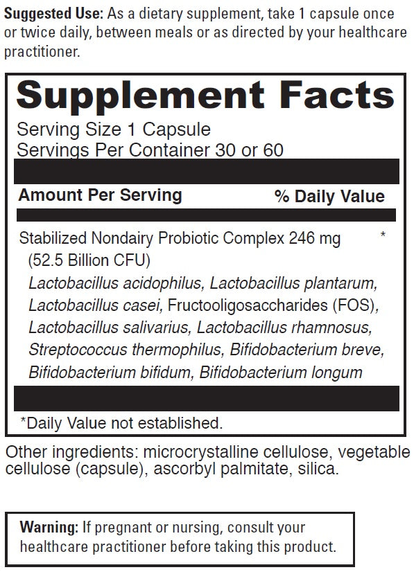 Probiotic 50 contains 9 species of microorganisms from non-dairy sources. Because each strain has an affinity for a different part of the digestive tract, and a unique mechanism of action, a product that delivers multiple strains is preferable to single strain products.