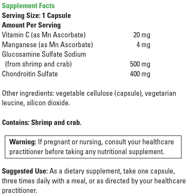 A dietary supplement to support connective tissue and joint functions. Chondroitin -4- and -6- Sulfates are two classes of glycosaminoglycans that are found in joint cartilage and aid in lubricating and hydration. Glucosamine is a natural amino sugar that is the starting point for the synthesis of glycosaminoglycans-the core of connective tissues such as collagen, bone matrix and mucous membranes.