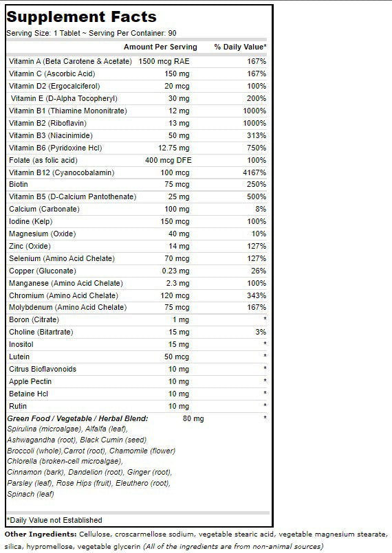 Get a wide variety of essential vitamins and minerals your body needs with DEVA Vegan Multivitamin. Balanced, multiple vitamin and mineral formula supplemented with green foods/special herbs formulated without animal derivatives making it suitable for vegans / vegetarians. DEVA Nutrition is pleased to offer this high potency, balanced multiple vitamin and mineral suitable for vegans, vegetarians and, anyone who prefers an animal-free multivitamin supplement for their nutritional needs. Besides a wide range of essential vitamins and minerals provided at 100% DV or more, Vitamin B-12 is provided at 100 mcg per serving (4167% DV) who feel taking these nutrients on a regular basis is important for their health and well being. It contains no iron for those who seek an iron-free multivitamin.