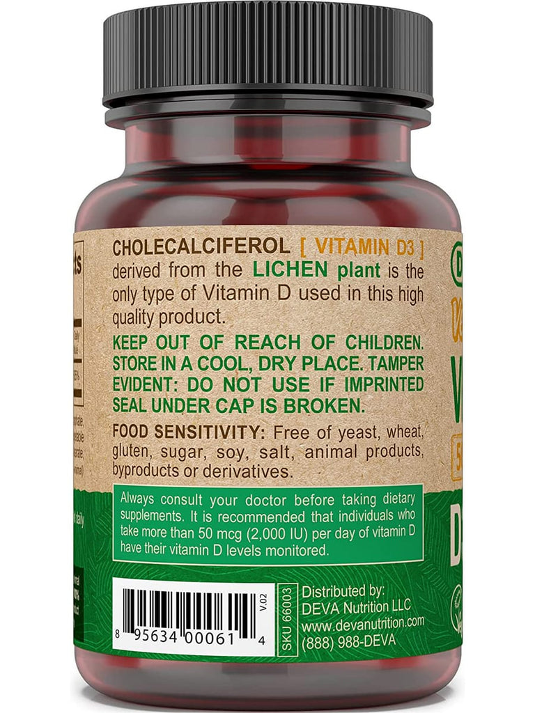 Deva Nutrition is excited to introduce its lichen-derived Vitamin D3 supplement that provides 5000 IU (125 mcg) of vegan-suitable vitamin D3 (cholecalciferol) per tablet. This new vegan D3 option is important because most commercial vitamin D3 products are made from lanolin, which usually comes from sheep's wool, something obviously not vegan. However, Deva uses a non-animal (i.e. lichen) derived cholecalciferol in this product for vegans and vegetarians who prefer Vitamin D3 in supplementation.