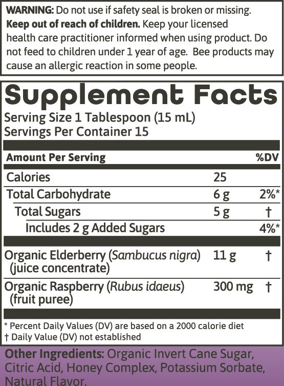 Gluten free, vegan, Halal, and Kosher, Dynamic Health Black Elderberry and Honey Tonic includes raspberry juice concentrate and natural raspberry flavor to make it a tasty treat. Sip it pure or mix with water, seltzer, juice, or a beverage of your choice.