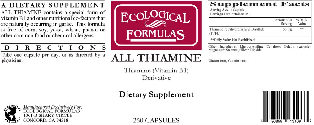 Formerly known as Allithiamine (Vitamin B1) ALL THIAMINE contains a special form of vitamin B1 and other nutritional co-factors that are naturally occurring in garlic. This formula is free of corn, soy, yeast, wheat, phenol and other common food or chemical allergens.