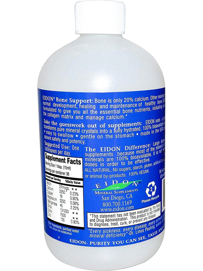 Eidon Bone Support is a comprehensive formulation utilizing current understanding of bone tissue and mineral composition. Support strength and flexibility throughout life with Eidon's liquid mineral formula for healthy bones.Calcium provides rigidity and shape to bone.