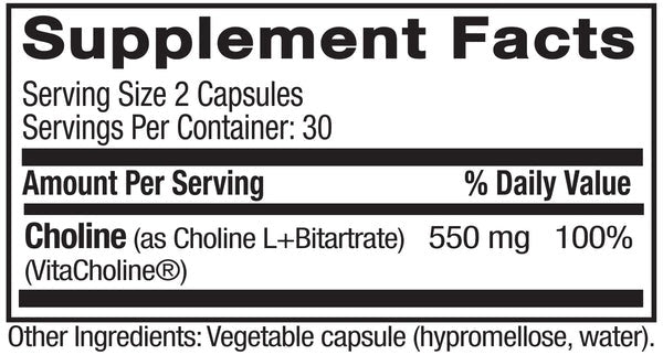 VitaCholine in its L+Bitartrate form is considered the “Gold-Standard”. Choline supports the production of the neurotransmitter acetylcholine which has been shown to support memory, mood and muscle health.