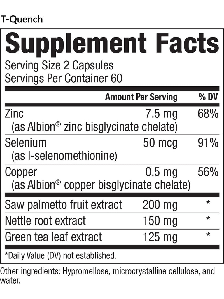 Our hormones are chemical messengers that dictate everything from metabolism to hair growth. Aging, stress levels, and even diet can alter hormonal balance. T-Quench utilizes powerful botanicals as well as important minerals to target hormone conversion, helping to maintain a balanced and well-regulated hormonal system.