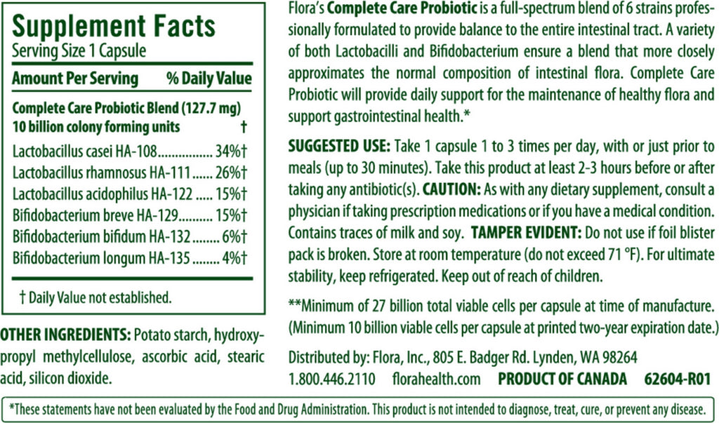 Flora's Complete Care Probiotic is a full-spectrum blend of 6 strains professionally formulated to provide balance to the entire intestinal tract. A variety of both Lactobacilli and Bifidobacterium ensure a blend that more closely approximates the normal composition of intestinal flora. Complete Care Probiotic will provide daily support for the maintenance of healthy flora and support gastrointestinal health.*