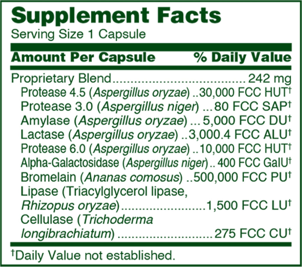 Take 1 capsule up to 3 times daily. Take 1 capsule with the first bite of food/meal. For a heavy meal, take an additional capsule in the middle of the meal.