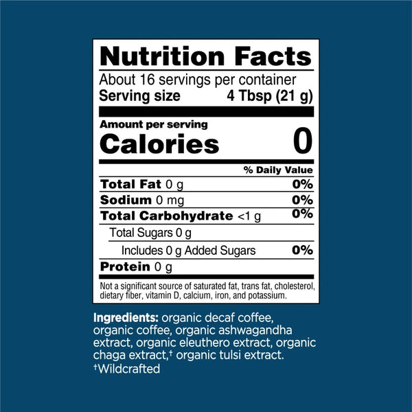 Lower caffeine, less stress in a half caf brew. Organic coffee infused with adaptogens to help you find calm, and balance body and mind.