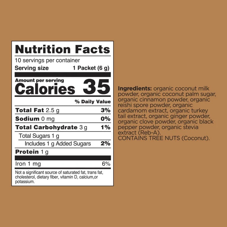 Warming chai spices meet calming benefits from reishi and turkey tail mushrooms. No caffeine or dairy, just a latte zen vibes.