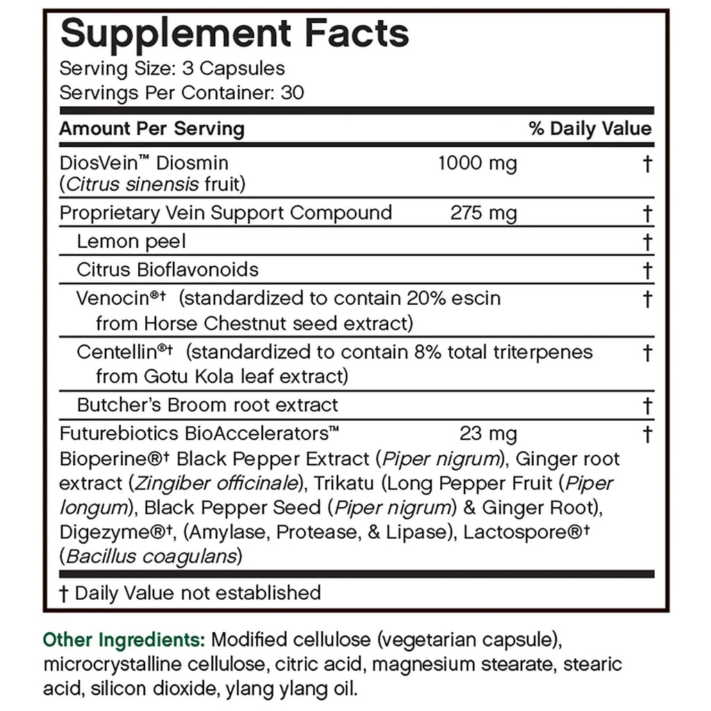 Damaged veins are a common condition. They are the result of damaged and weak vein walls and valves and typically form when blood pressure increases in the veins. They are most often seen in the legs because standing and walking cause increased pressure in the lower part of the body. Varicose veins can be exacerbated by carrying excess weight, so those that are overweight and obese are most often affected but they can also become more common as we age. Futurebiotics VeinFactors vein supplement is formulated with clinically studied DiosVein, a proprietary blend of diosmin and hesperidin. These antioxidant flavonoids are made from citrus rinds and have been shown to support cardiovascular health while maintaining healthy blood flow. DiosVein is made with "micronized" diosmin, which helps to increase absorption and efficacy.