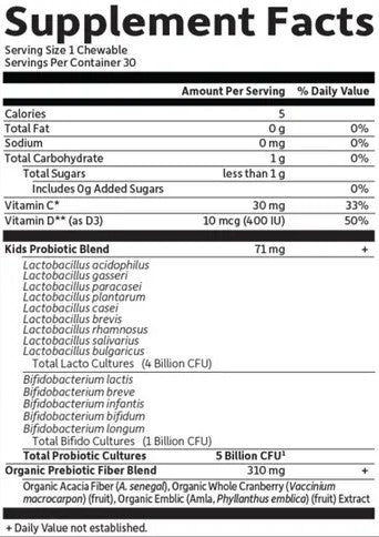 - Vitamin C from organic Amla (30mg); vitamin D (400IU) and prebiotic fiber