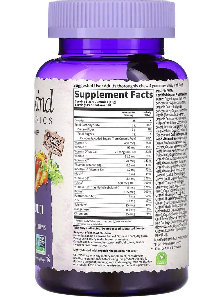 The mykind Organics line of gummies is a true health crusader, ditching the conventional vitamin gummy course by steering clear of processed sugars and syrups, artificial colors and flavorings, animal products, and GMOs. With our clean gummy technology, there are no “candy” ingredients, no pig gelatin or corn starch. You can rest assured you are receiving a true, whole food vitamin fruit chew that not only is good for you, but is great-tasting! They are Certified USDA Organic, Non-GMO Project Verified, Certified Vegan, Certified Gluten Free and Kosher.