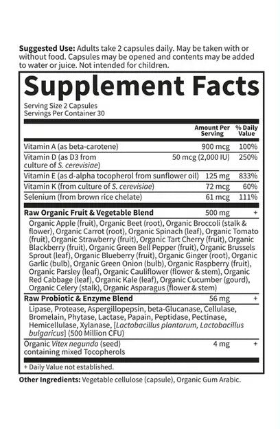 Adults take 2 capsules daily. May be taken with or without food. Capsules may be opened and contents may be added to water or raw juice. Not intended for children.