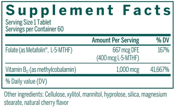 In addition to vitamin B12‚ Active Chewable B12 with L-Methylfolate also provides 400 micrograms of Metafolin®. Metafolin® (L-methylfolate) is a unique form of folate‚ another water-soluble B complex vitamin. Folate may provide support for circulation and cell formation.