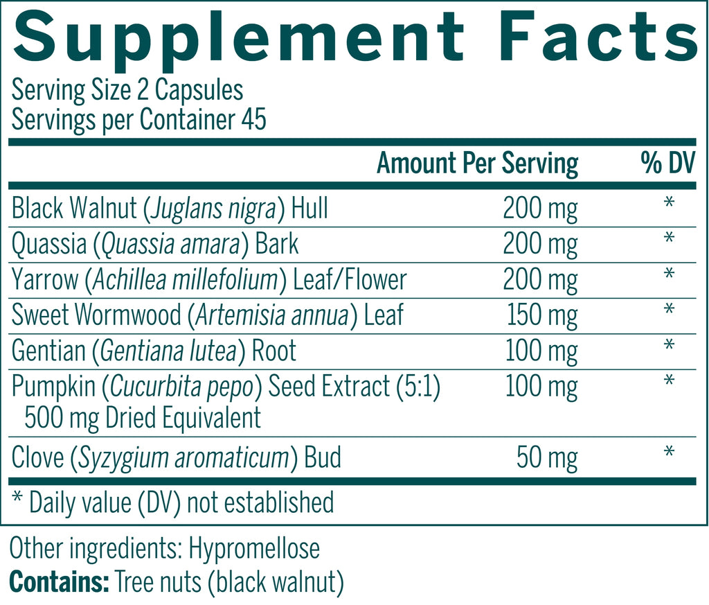 A synergistic blend of herbs may provide additional support for your overall well-being. Quassia is considered to be a stomach bitter that may work to help maintain digestive health. Black Walnut Capsules also contain gentian‚ which may help manage healthy levels of gastric secretions. Meanwhile‚ clove is a spice that may help alleviate symptoms associated with upset stomach‚ possibly by working to smooth and relax the intestinal lining; it may also aid in fighting off some parasites and bacteria.