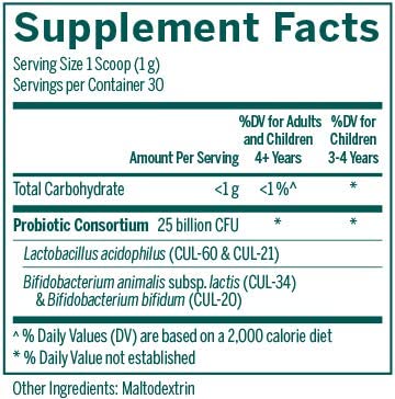 - Provides 25 billion CFU per day of two strains of Lactobacillus acidophilus, Bifidobacterium bifidum, and Bifidobacterium animalis subsp. lactis