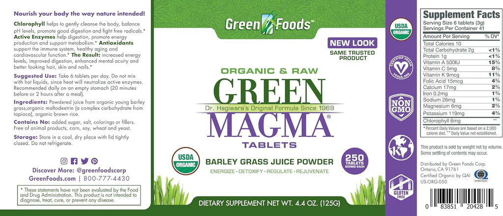 Green Foods, Organic and Raw Green Magma Tablets, 500 mg, 250 Tablets, 4.4 oz