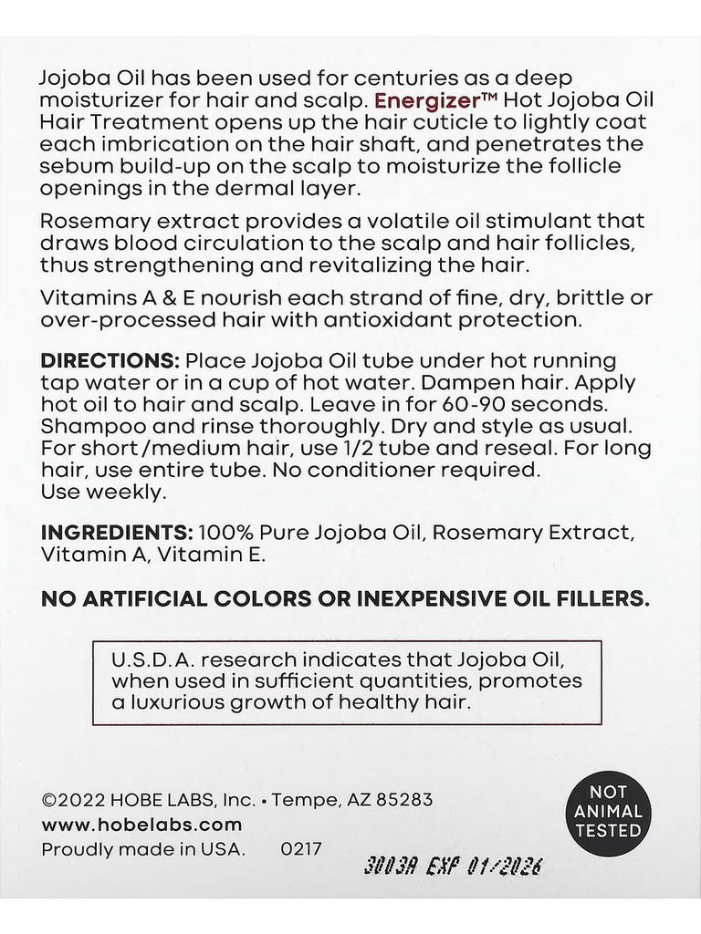 Jojoba Oil has been used for centuries as a deep moisturizer for hair and scalp. EnergizerHo t Jojoba Oil Hair Treatment opens up the hair cuticle to lightly coat each imbrication on the hair shaft and penetrates the sebum build-up on the scalp to moisturize the follicle openings in the dermal layer.