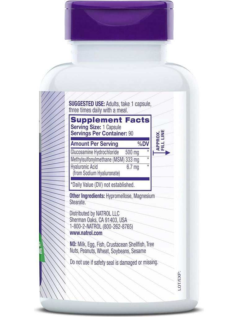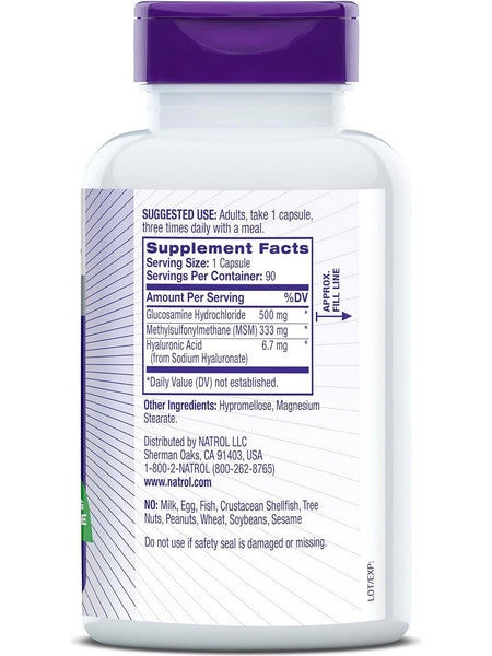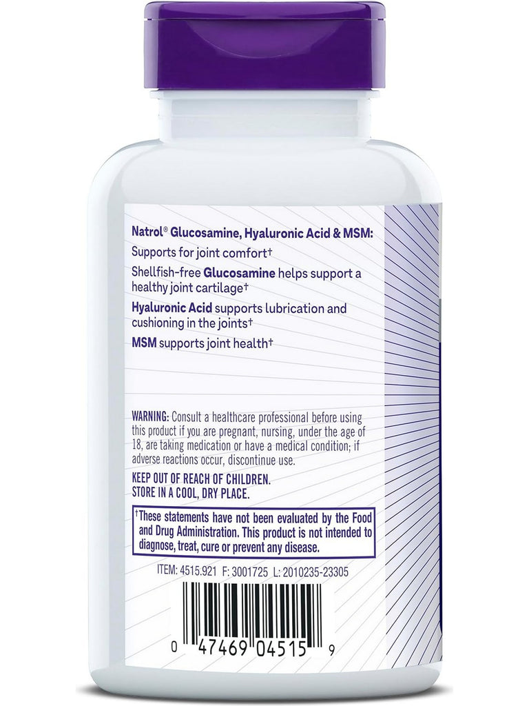 Natrol Hyaluronic Acid MSM and Glucosamine supports joint health with three compounds known for their joint-tissue benefits.