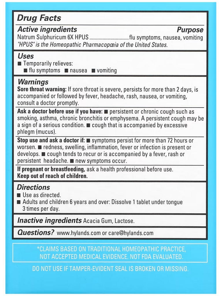Nat. Sulph. (Natrum Sulphuricum) is the cell salt indicated for relief from symptoms of the flu, including rheumatic pains, nausea, and vomiting. It is particularly useful in instances where symptoms are aggravated by cold, wet weather or damp places. Tablets are flavorless and dissolve immediately without water for no upset stomach.