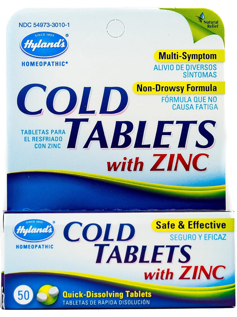 Homeopathic. 100% Natural. No side effects. Soft tablets dissolve instantly. Hyland's Cold Tablets with Zinc Quick Dissolving Tablets provide fast, natural relief from symptoms of the common cold. The drippy misery of runny nose, headache and nasal congestion are relieved with these homeopathic tablets that dissolve immediately in your mouth. This all natural homeopathic formula works without side effects and won't interact with other medications-day or night!