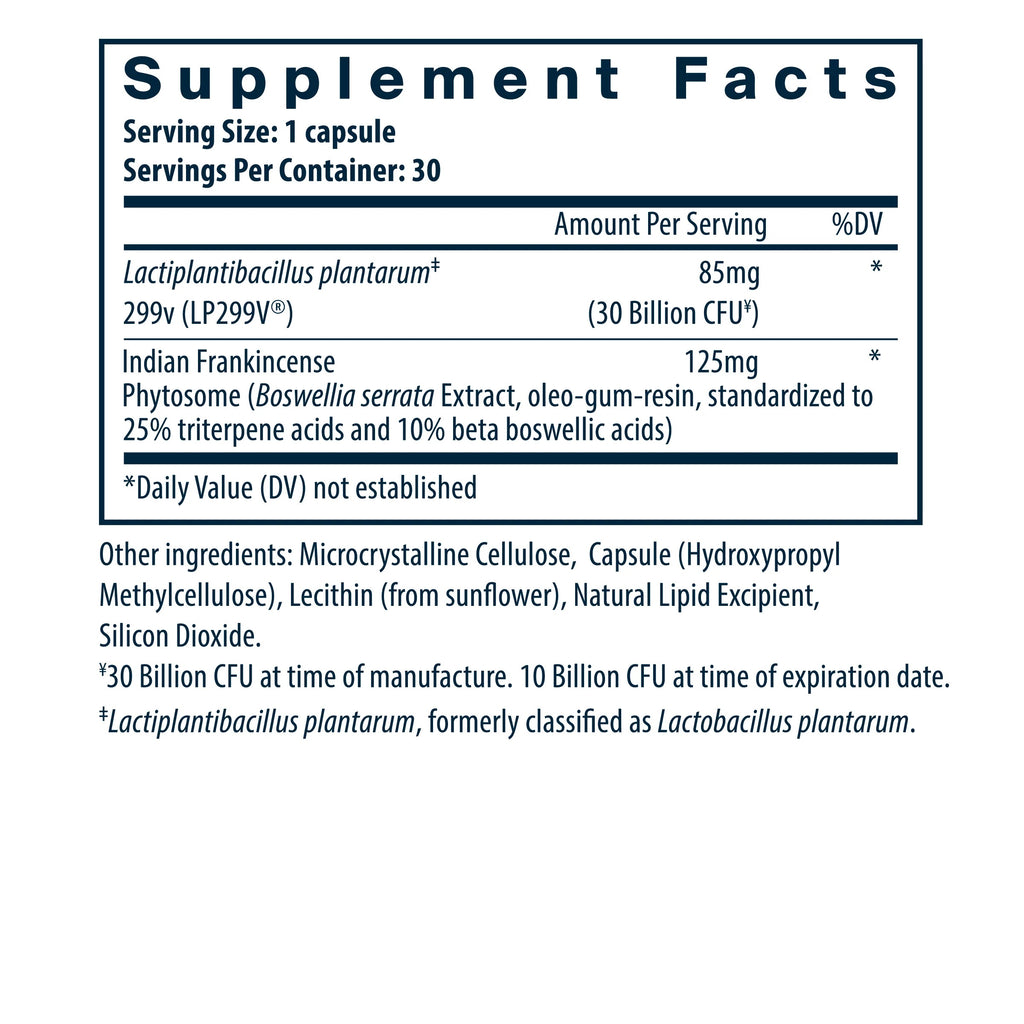 PRO-IBS Support features a highly stable and patented probiotic strain, Lactiplantibacillus plantarum 299V, combined with Boswellia serrata extract to improve absorption and utilization. This unique combination formula is designed to stabilize gut function while providing accelerated and prolonged relief from occasional bloating, gas, and irregularity.