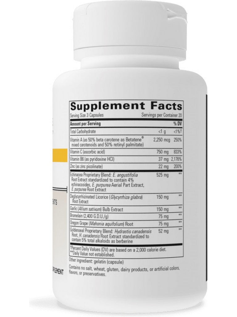 EHB provides echinacosides from Echinacea and alkaloids including hydrastine, berberine, and canadine from a proprietary blend of Goldenseal and Oregon grape (Mahonia aquifolium) root. Echinacea used in EHB is from a proprietary blend of E. angustifolia, purpurea, and pallida species. Other herbs included in the formula include garlic (Allium sativum,) deglycyrrhizinated licorice (Glycyrrhiza glabra) root, and ginger (Zingiber officinale) root. Vitamins A, C, B6, and zinc are included in substantive amounts.