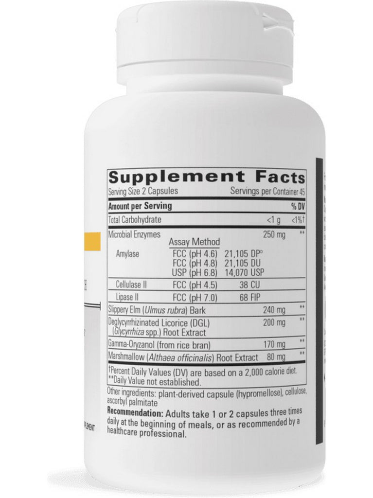 Clinician-developed Similase Sensitive Stomach combines Microbial Enzymes with the demulcent herbs marshmallow and slippery elm to provide gentle support for the GI tract. Gamma-oryzanol and licorice root complement the demulcent herbs. Protease is omitted due to its potential for irritation in sensitive patients.