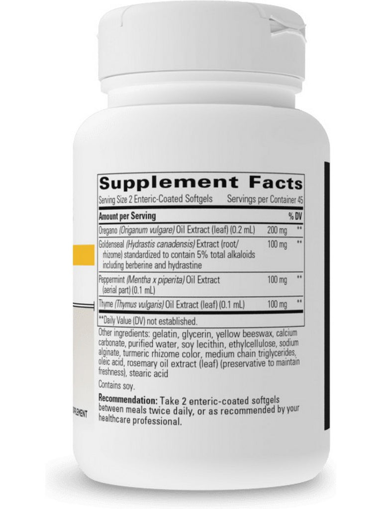 Herbal blend including oregano, goldenseal, peppermint and thyme, to support healthy microbial balance.