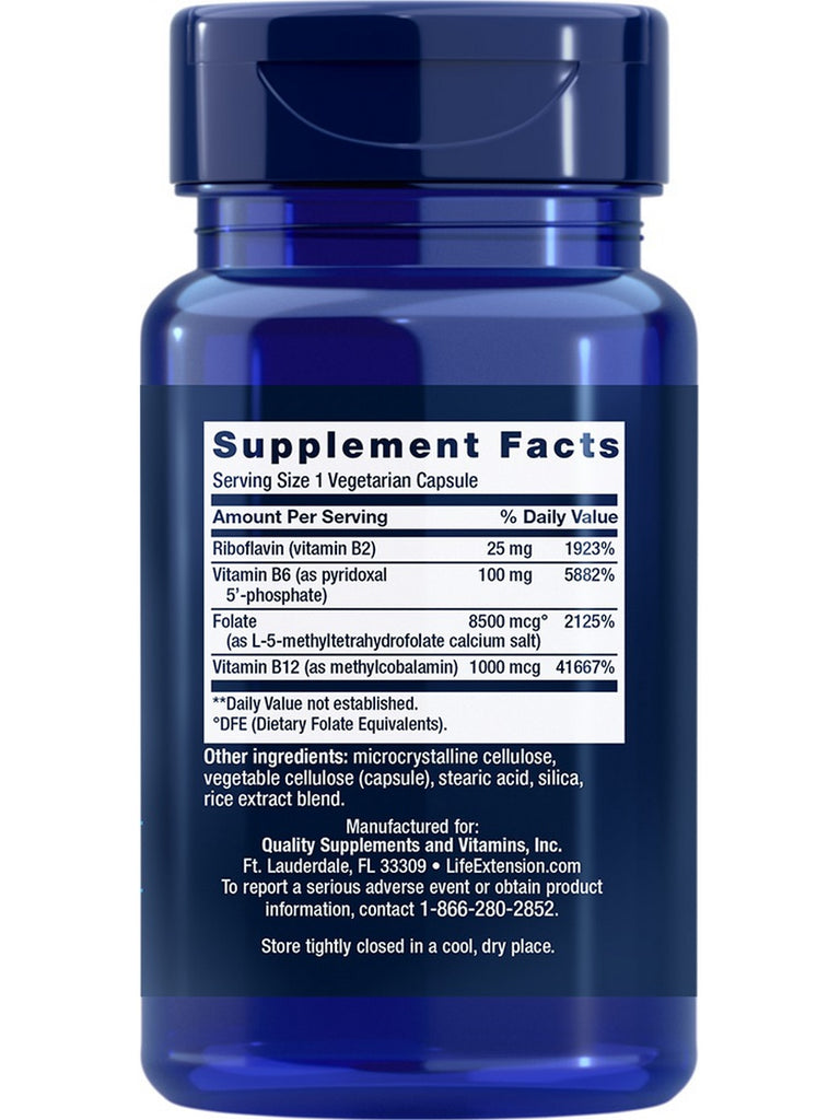 This formulation combines vitamins B2 (riboflavin), B6 and B12, plus folate as L-5-methyltetrahydrofolate (L-5-MTHF).