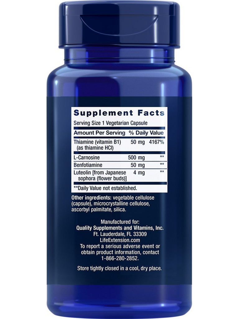 Super Carnosine protects DNA with powerful antioxidant properties plus luteolin, thiamine (vitamin B1) and benfotiamine.